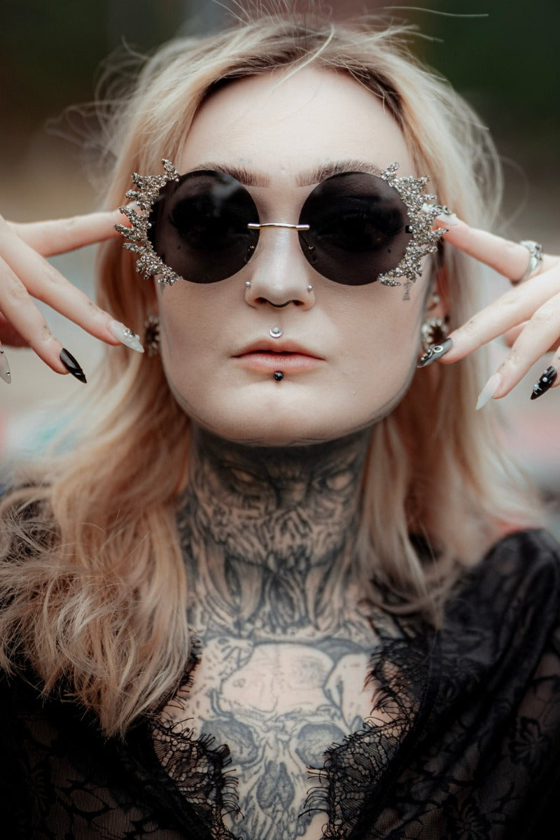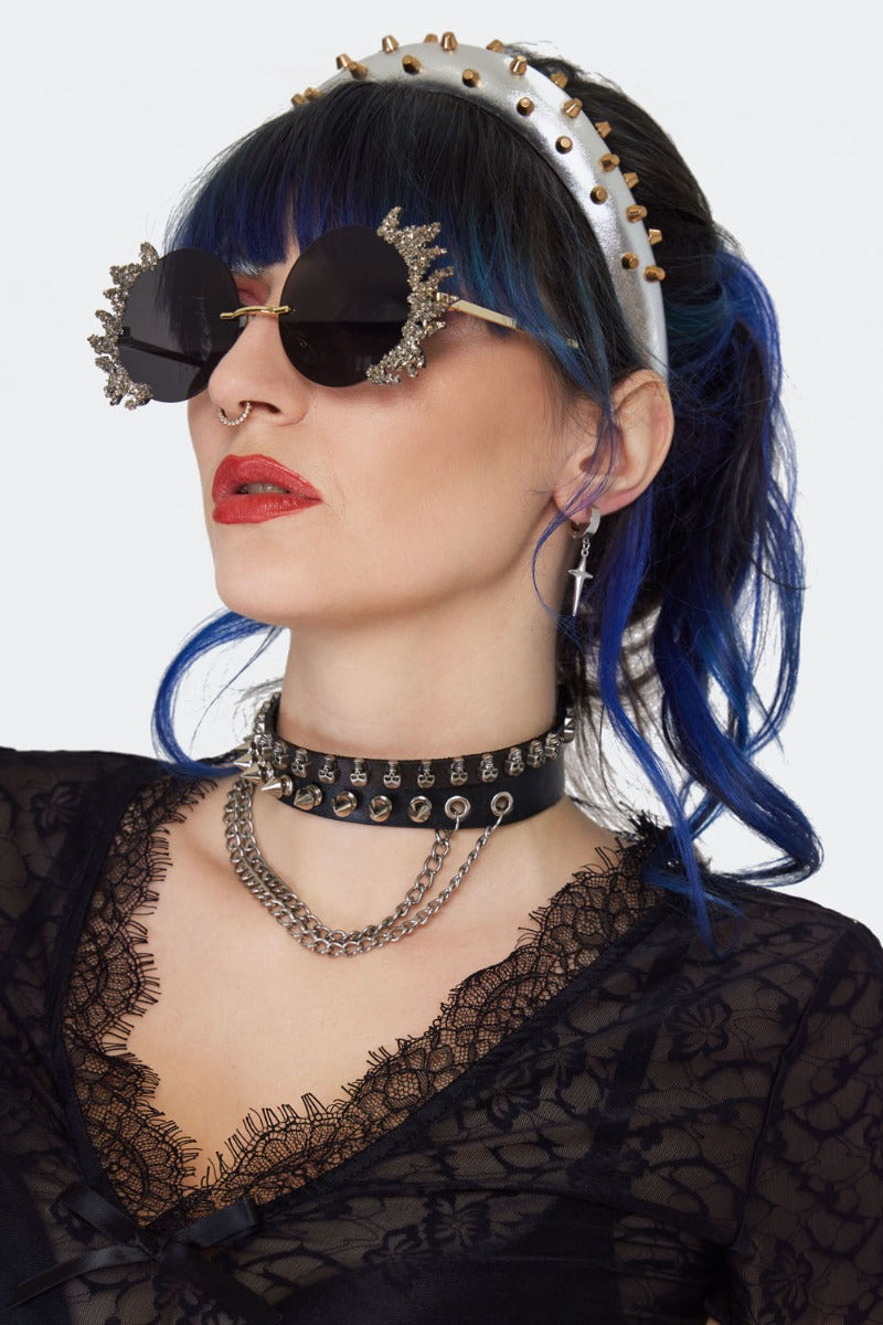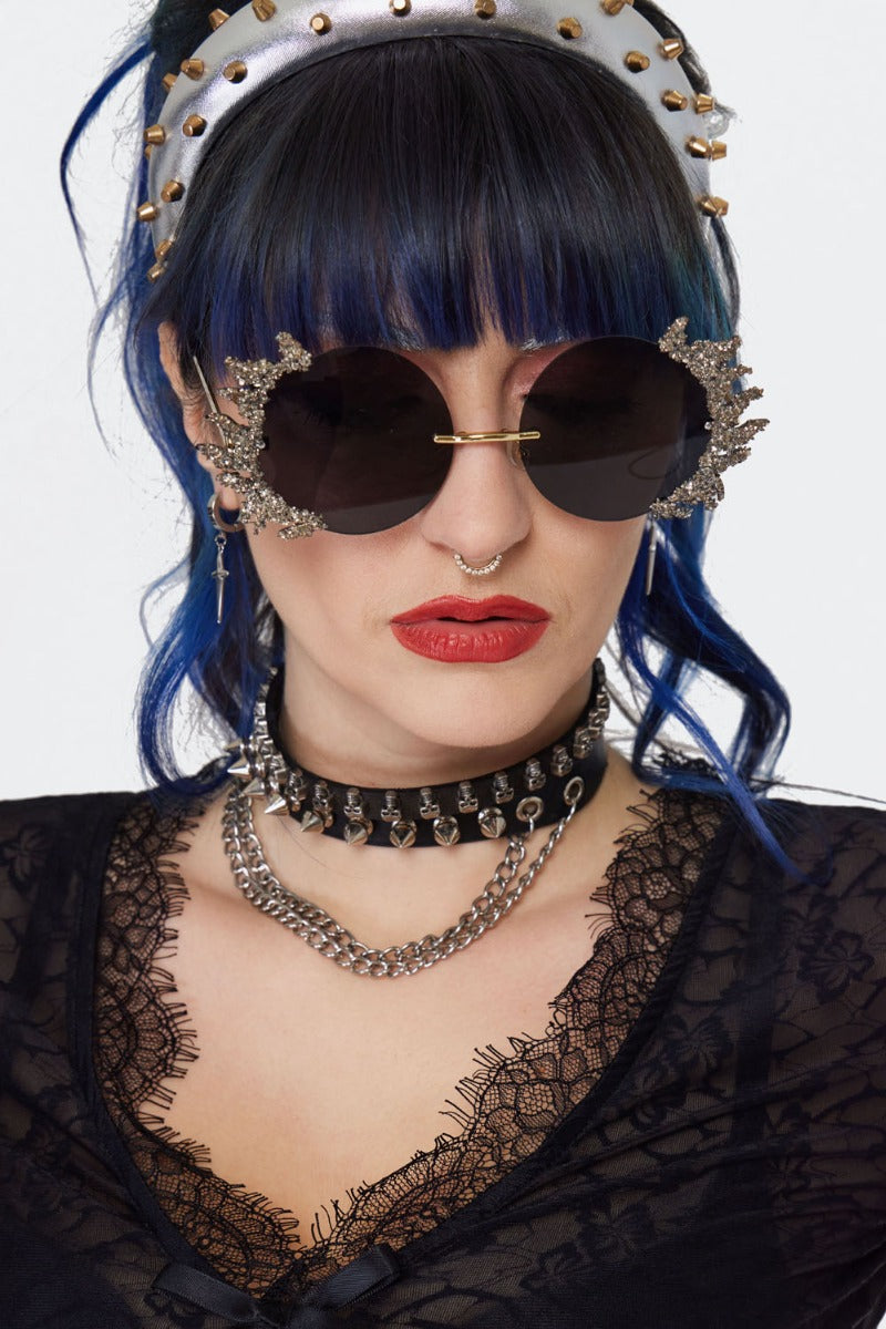 90s style round black lensed sunglasses with a glittery silver flame detail on a thin gold metal frame.