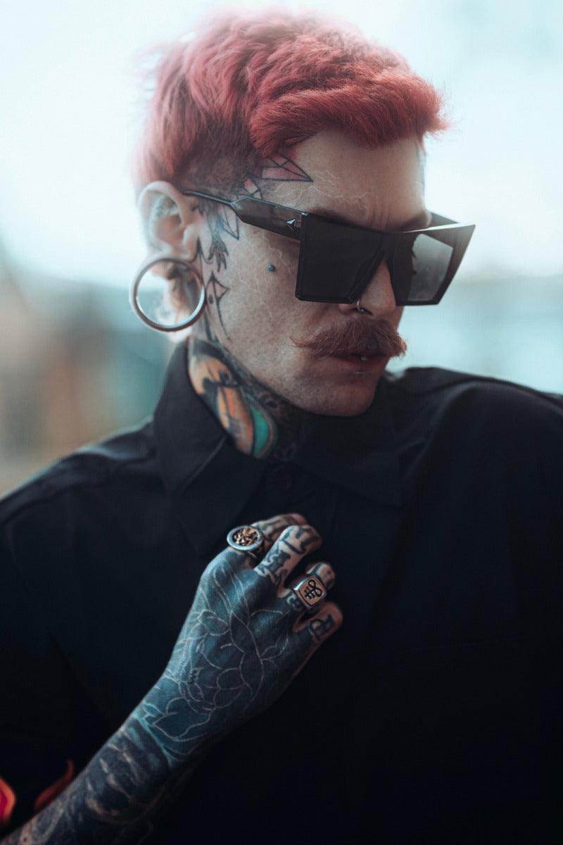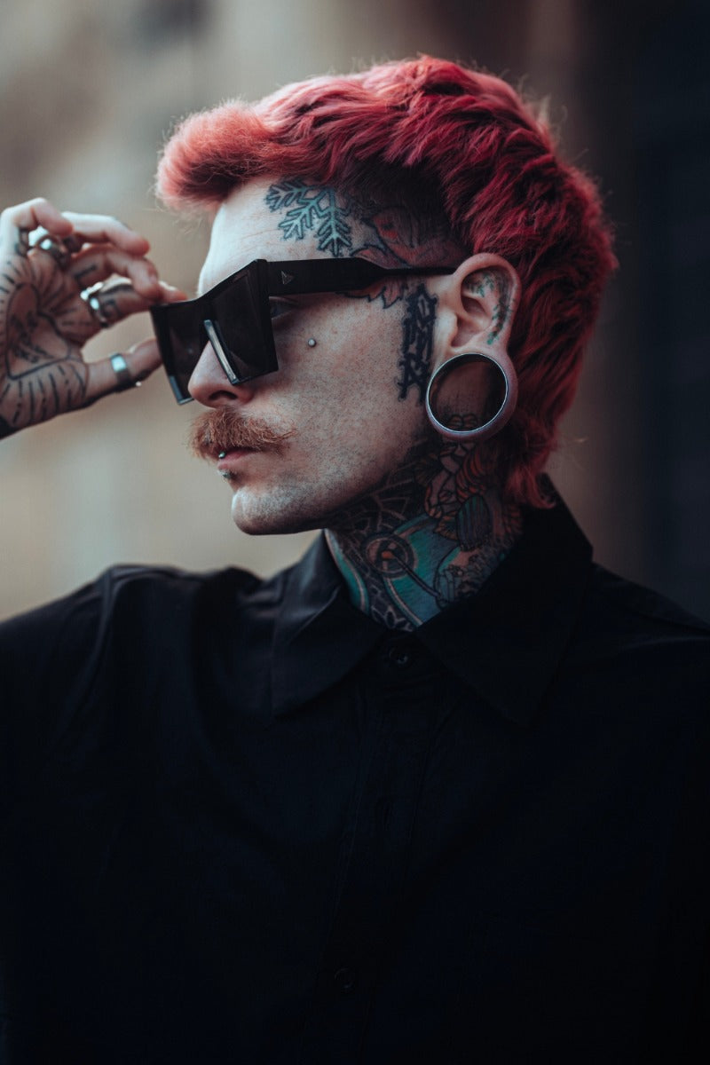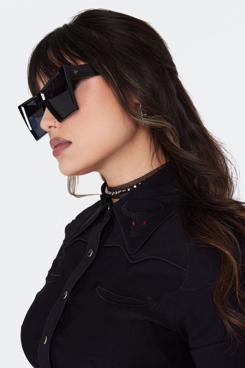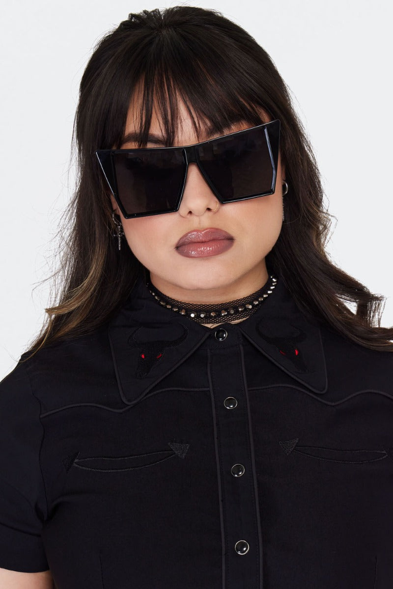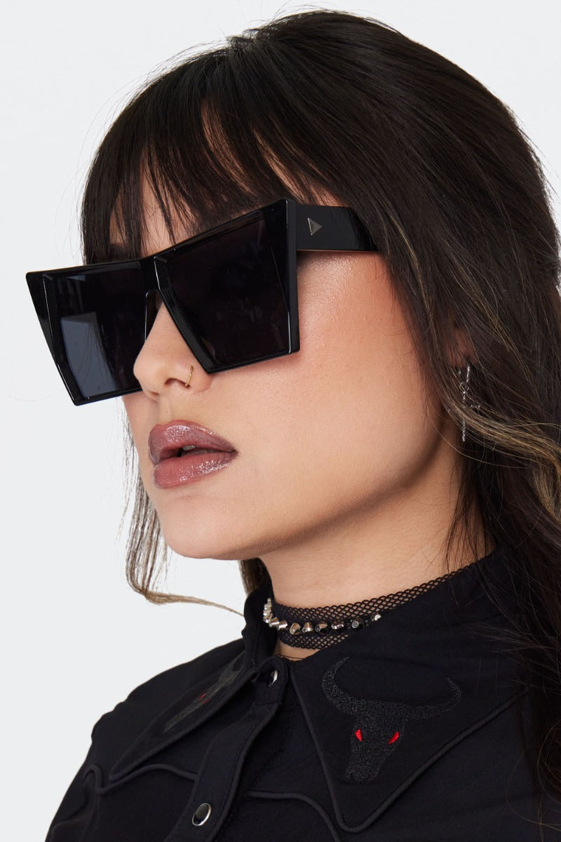 Gothic style chunky black sunglasses in a oversized squared cat eye shape with a chunky lightweight plastic frame.