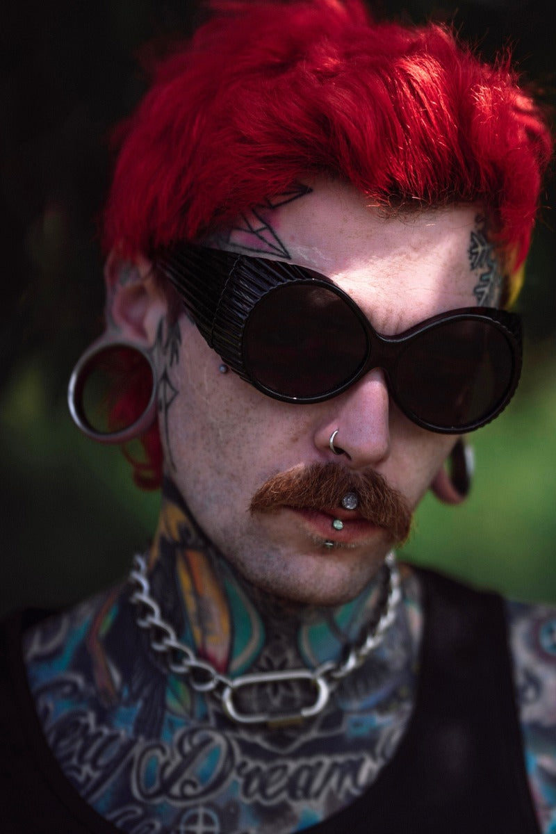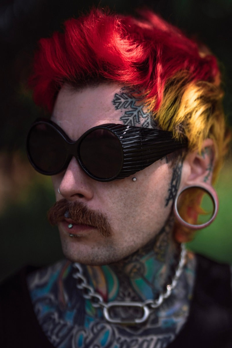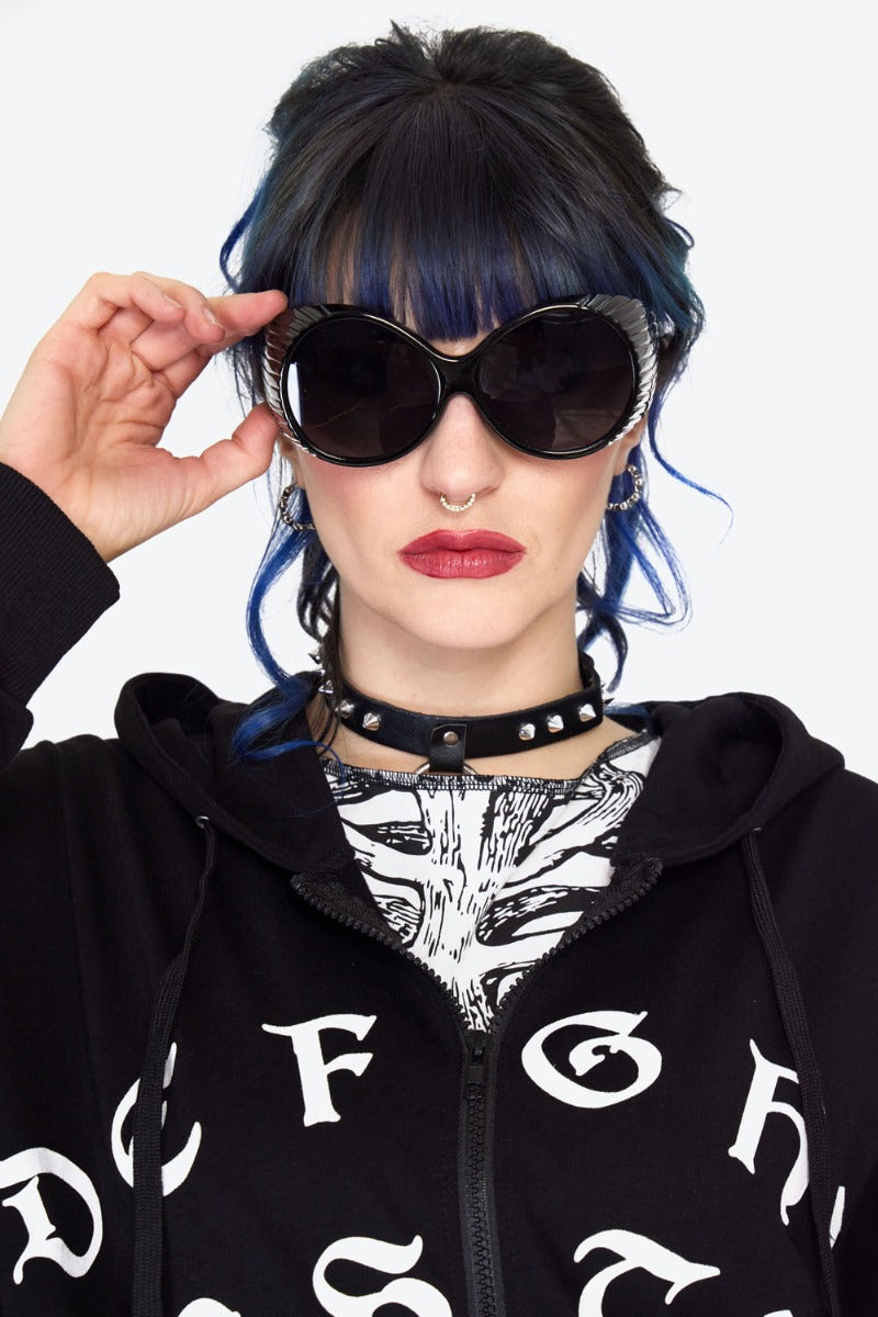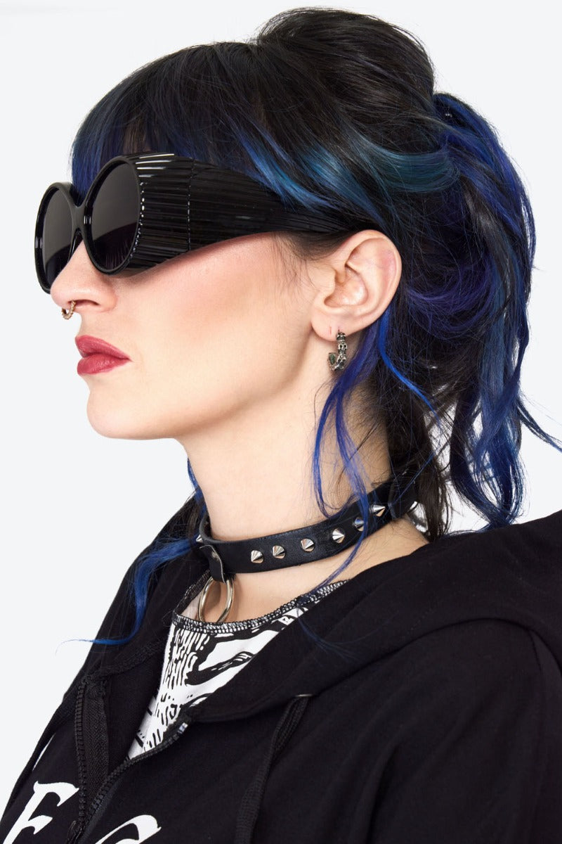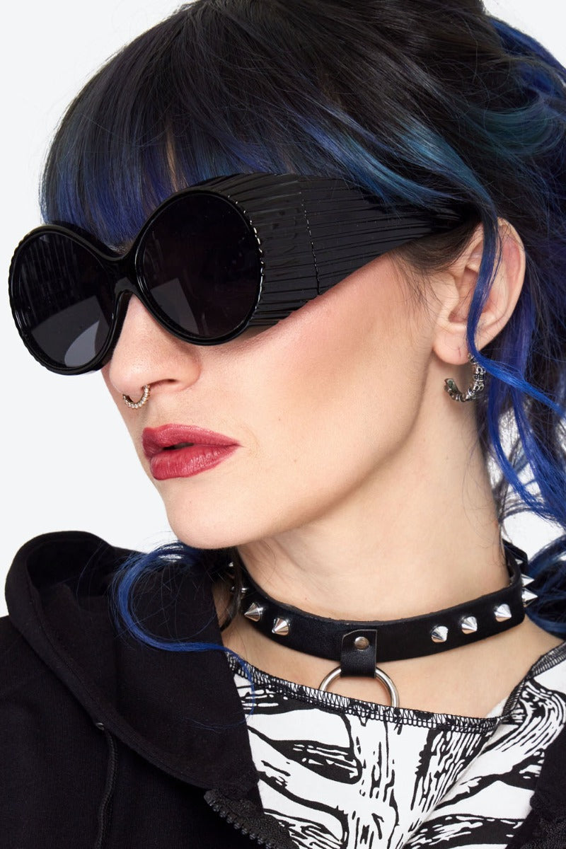 Black oversized goth style sunglasses with a goggle style design with oval black tinted lenses, stripe pattern