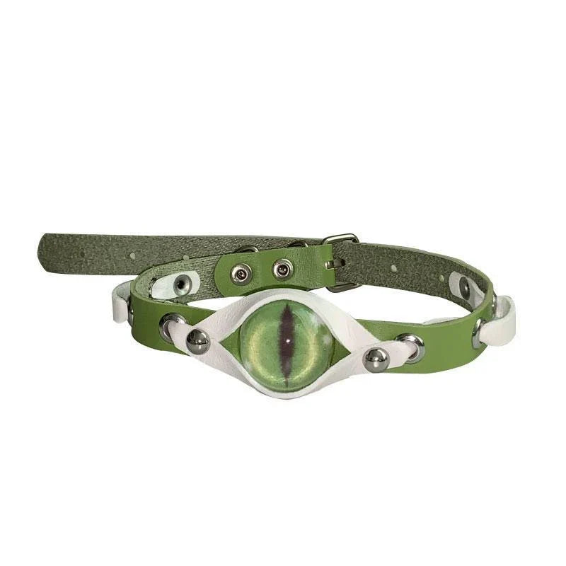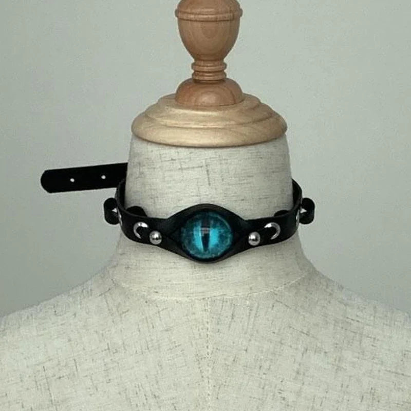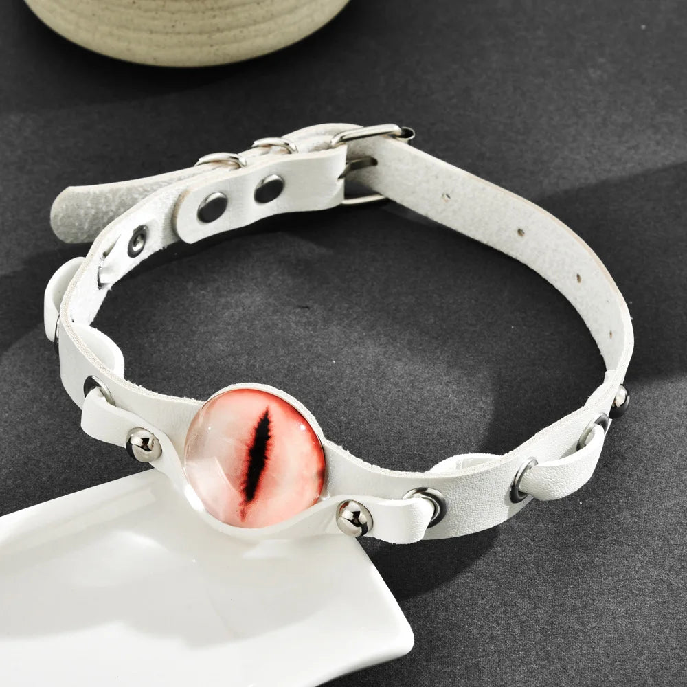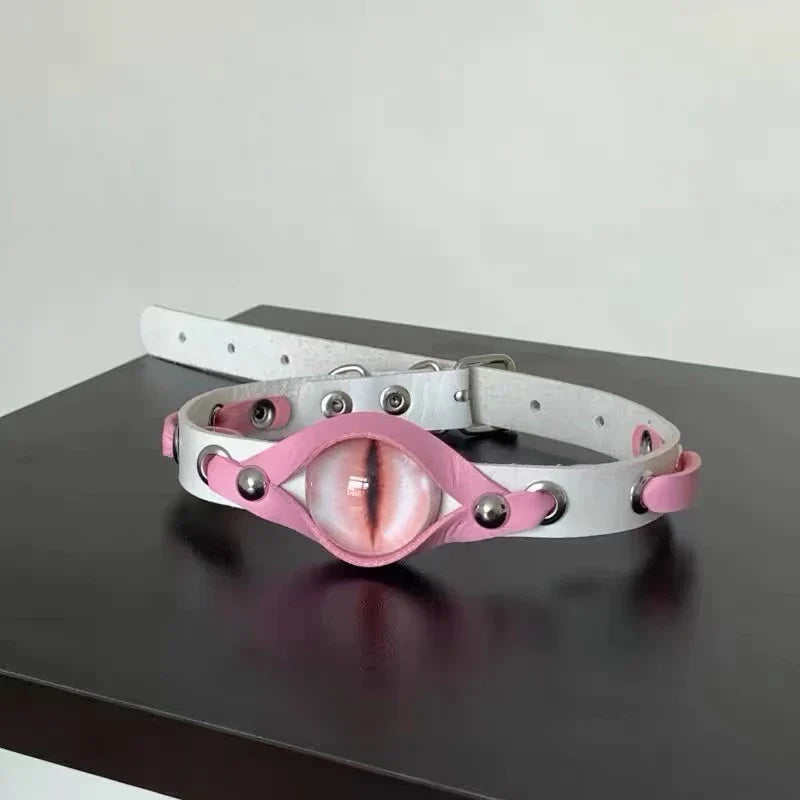 Be bold and fearless with our GODZILA EYE CHOKER! This rave accessory adds a daring touch to your style. Made with a cool leather design, it features evil eyes in a bold pink hue. Stand out in the crowd with this unique Harajuku goth necklace, exclusively for women.