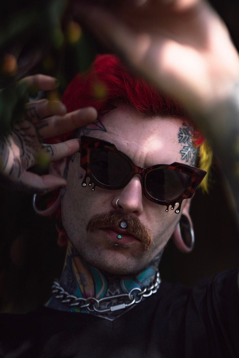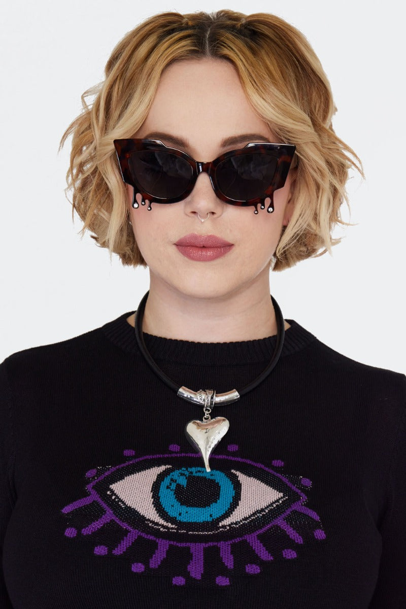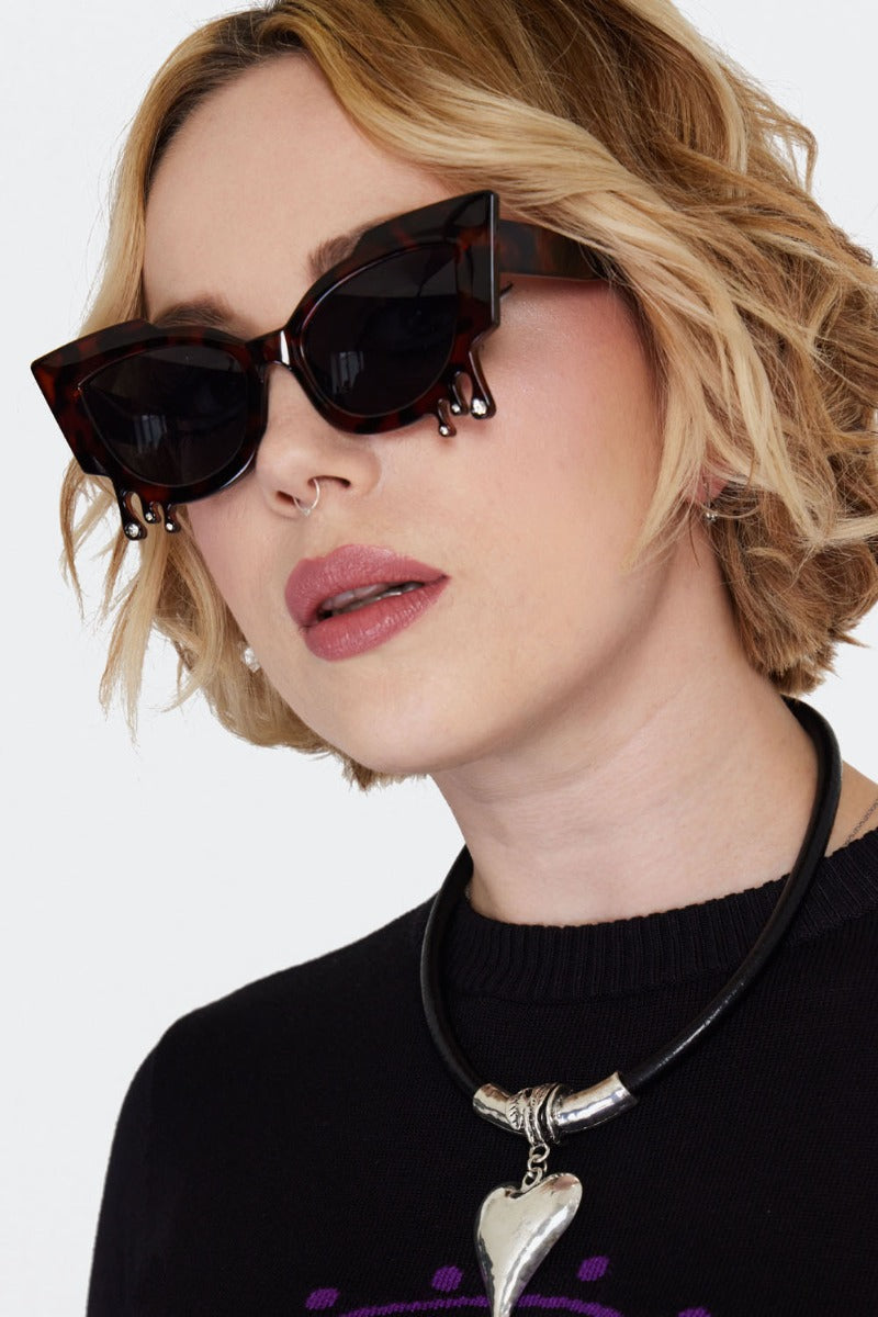 Cat eye style tortoiseshell pattern sunglasses with melted drip effect design embellished with rhinestones made with a lightweight plastic frame.